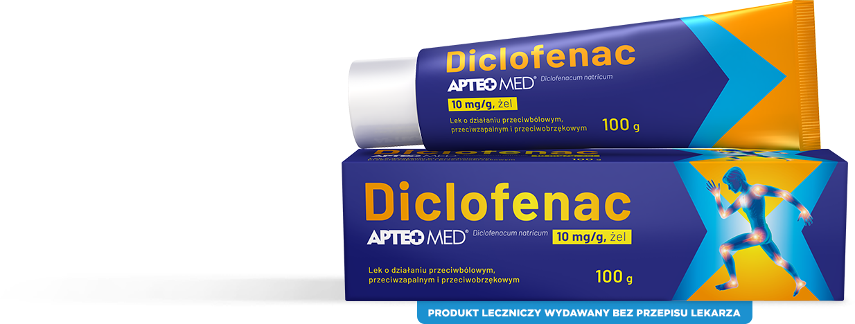 Diclofenac APTEO MED, 10 mg/g, żel Jeden gram żelu Diclofenac APTEO MED zawiera 10 mg diklofenaku sodowego (Diclofenacum natricum). Wskazania do stosowania Diclofenac APTEO MED jest wskazany do stosowania u dorosłych i młodzieży w wieku powyżej 14 lat. Produkt działa przeciwbólowo, przeciwzapalnie i przeciwobrzękowo. Stosowany jest w miejscowym leczeniu: Dorośli i młodzież w wieku powyżej 14 lat: - pourazowych stanów zapalnych ścięgien, więzadeł, mięśni i stawów (np. powstałych wskutek skręceń, nadwyrężeń lub stłuczeń), -bólu pleców, - ograniczonych stanów zapalnych tkanek miękkich takich jak: zapalenie ścięgien, łokieć tenisisty, zapalenie torebki stawowej, zapalenie okołostawowe. Dorośli (w wieku powyżej 18 lat): - ograniczonych i łagodnych postaci choroby zwyrodnieniowej stawów. Podmiot odpowiedzialny: Synoptis Pharma Sp. z o.o., ul. Krakowiaków 65, 02-255 Warszawa